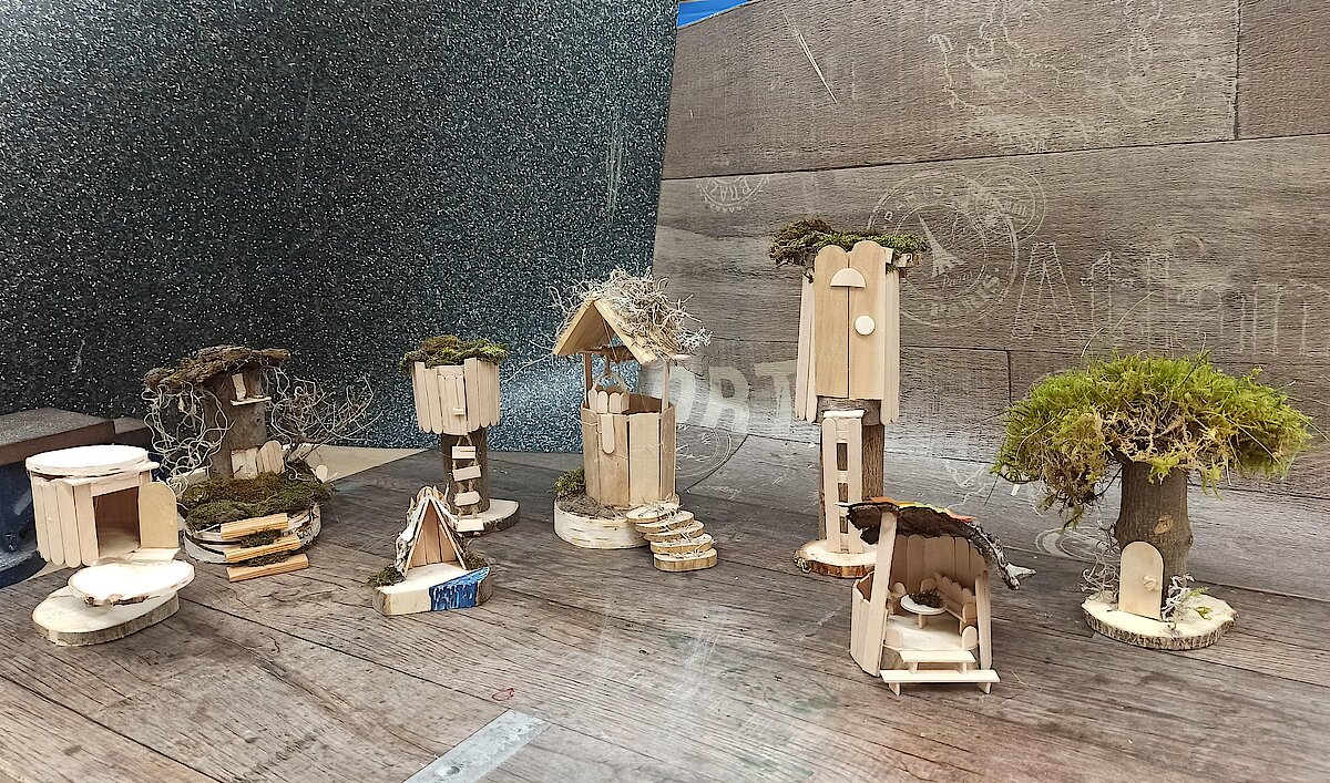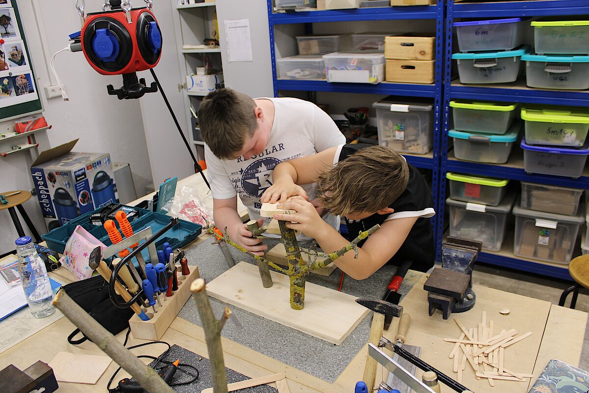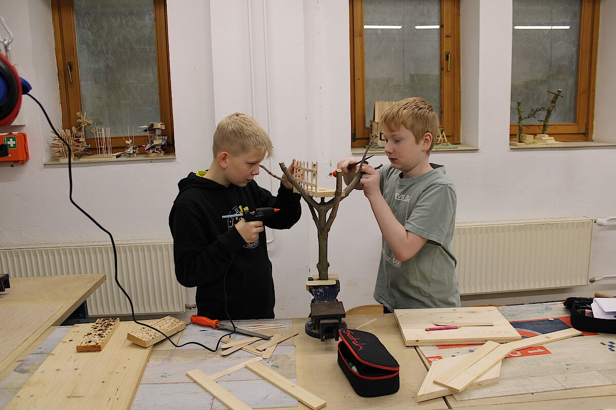 In der 5. Klasse durften wir in der Praxis bei Frau Lampert kleine Baumhäuser-Modelle in Teams bauen. Diese bestanden aus einer Grundplatte, auf die anschließend eine Astgabelung geschraubt und darin das Baumhaus montiert wurde. Die Modelle haben wir aus Naturmaterialien und Holzstäbchen in verschiedenen Größen gebaut. Wer wollte durfte auch von Zuhause Deko für das Baumhaus mitbringen. So entstanden verschiedenste Modelle, in allen Größen, Formen und Farben.