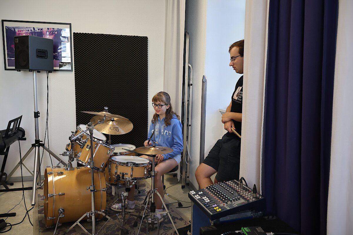 In kleinen Gruppen lernten die Kinder die Vielfalt der Instrumente kennen – und konnten sich natürlich auch selbst ausprobieren. Am Schlagzeug war Taktgefühl gefragt, das einige schon erstaunlich gut unter Beweis stellten. Bei E-Gitarre und Bass wurde gefühlvoll gezupft, und die ersten Töne konnten sich durchaus hören lassen.