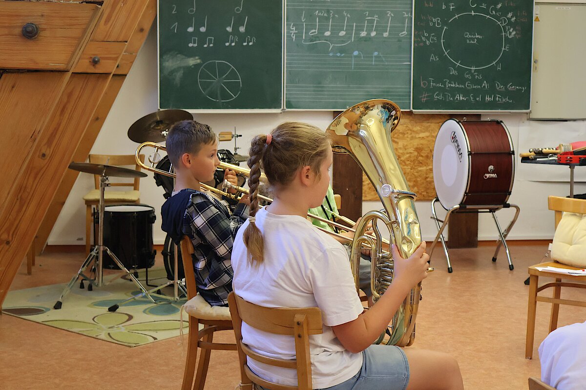 Besonders spannend wurde es im Gesangszimmer: Hier wurden die Stimmen aufgewärmt, und am Mikrofon durfte jeder zeigen, welche Klangfarbe in seiner Stimme steckt. Deutlich lauter ging es bei den Blechbläsern zu – Trompete und Tuba forderten ordentlich Puste, aber auch hier zeigten sich erste Talente.