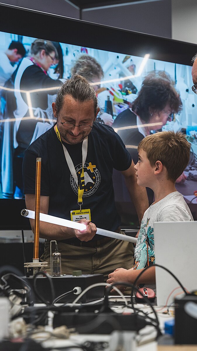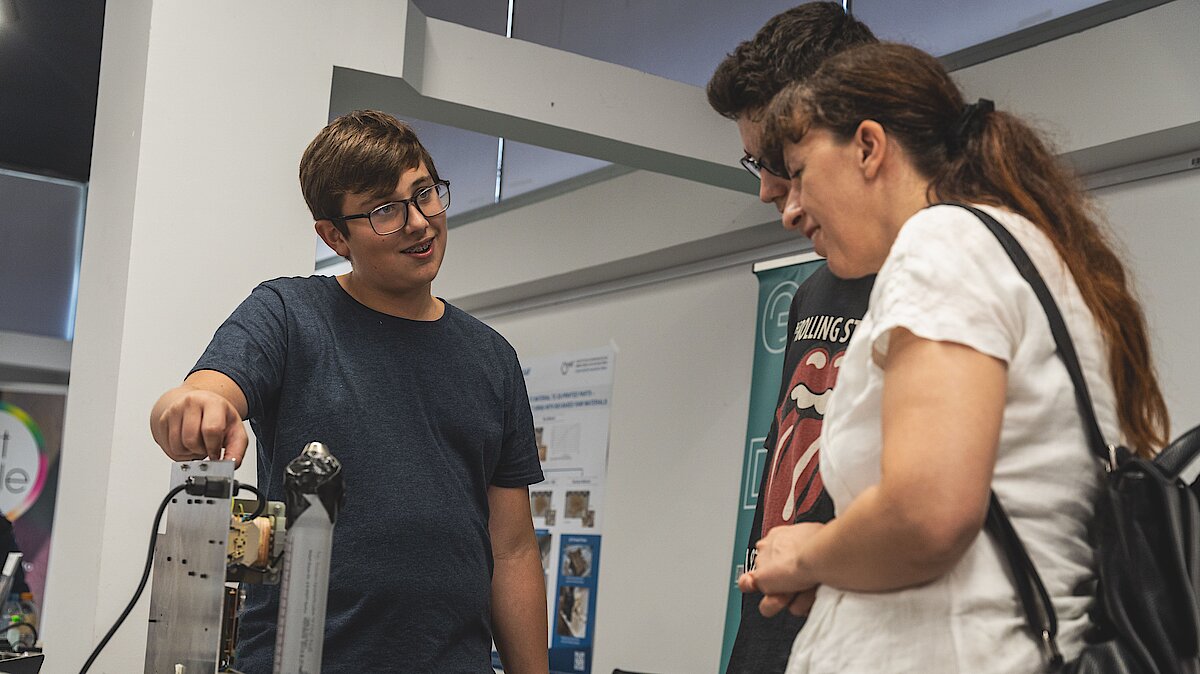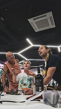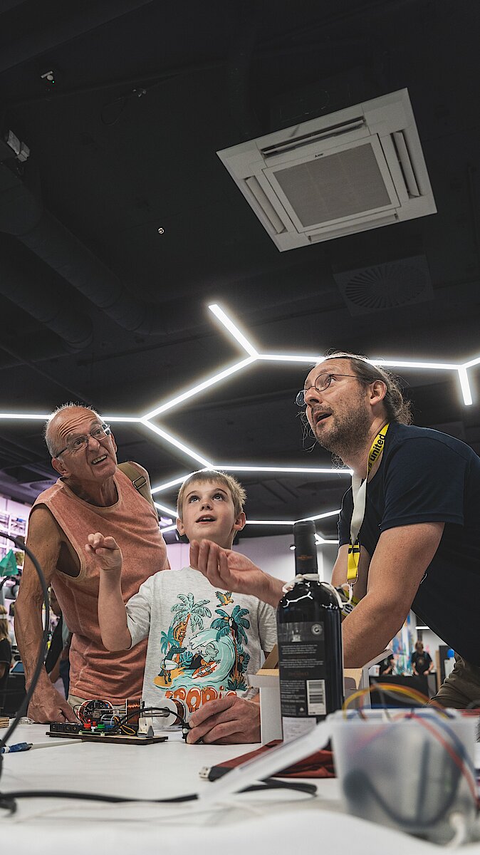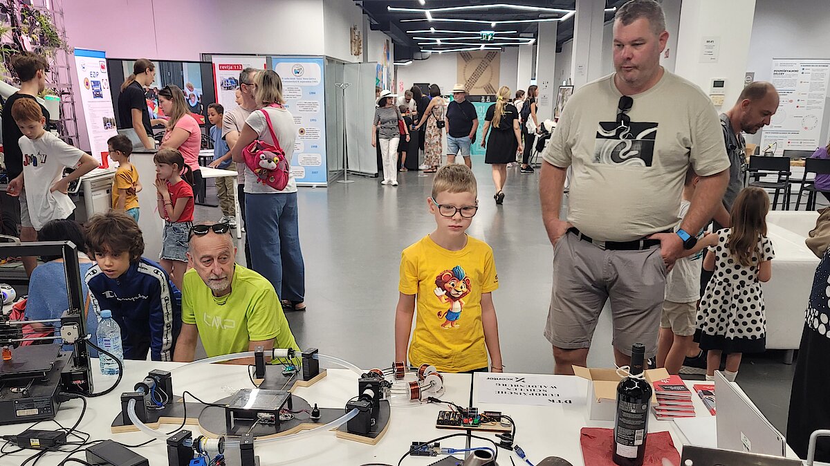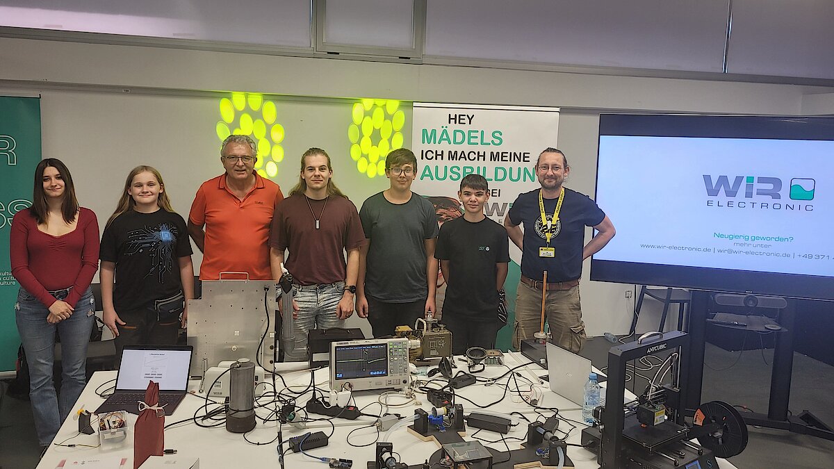 Our school was represented by the students Felix Meinhard, Marciello Brignoccoli, and Louis Heinig, together with our colleague Mr. Theumer, who participated with an exhibition booth at the Technical Culture Days in the XCenter. Supporting representatives included Ms. Josephine Harzer, an apprentice from Don Bosco, and Mr. Koczielski from WIR electronic GmbH. This cooperation was made possible in previous years primarily through the commitment of the Chemnitz Industrial Association under the leadership of Ms. Hoffmann.