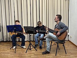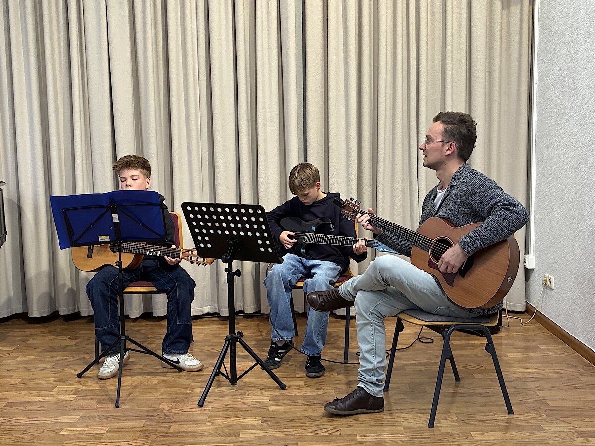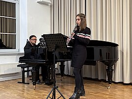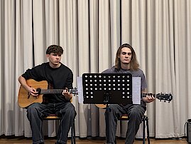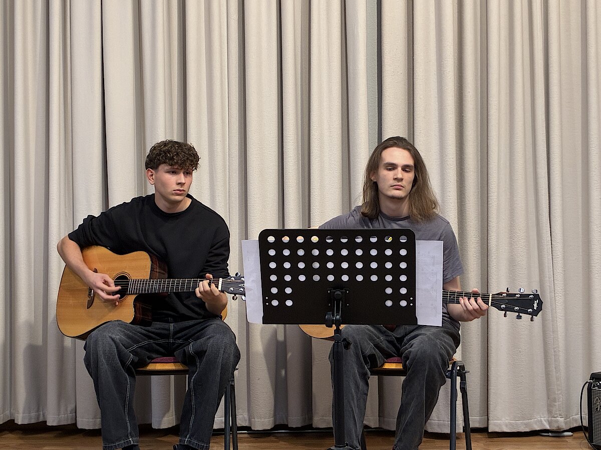 Lena Calov begeisterte mit der Klarinette und dem mitreißenden Stück „Kletzmeron“. Alexander Schultze präsentierte gemeinsam mit seinen Schülern Vincent Schröder und Nils Kaufmann (Außenstelle Meerane) eine Gitarrentrio-Version von „Numb“. Henriette Eger zeigte ihr vielseitiges Talent und spielte am Flügel ein weiteres Stück von Ludovico Einaudi. Den Abschluss bildete ein Gitarrenduo mit Albert Krüger und Leopold Helbig, die „Shallow“ von Lady Gaga in einer eigenen Version interpretierten.