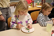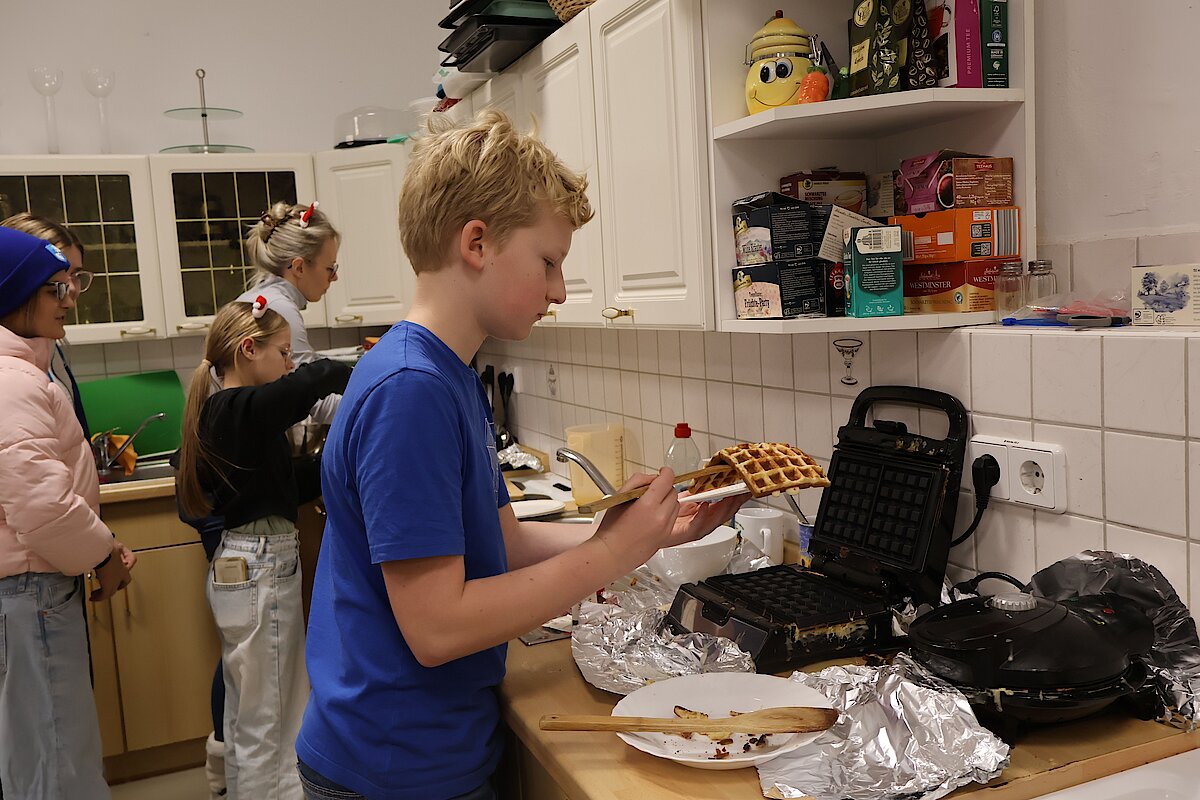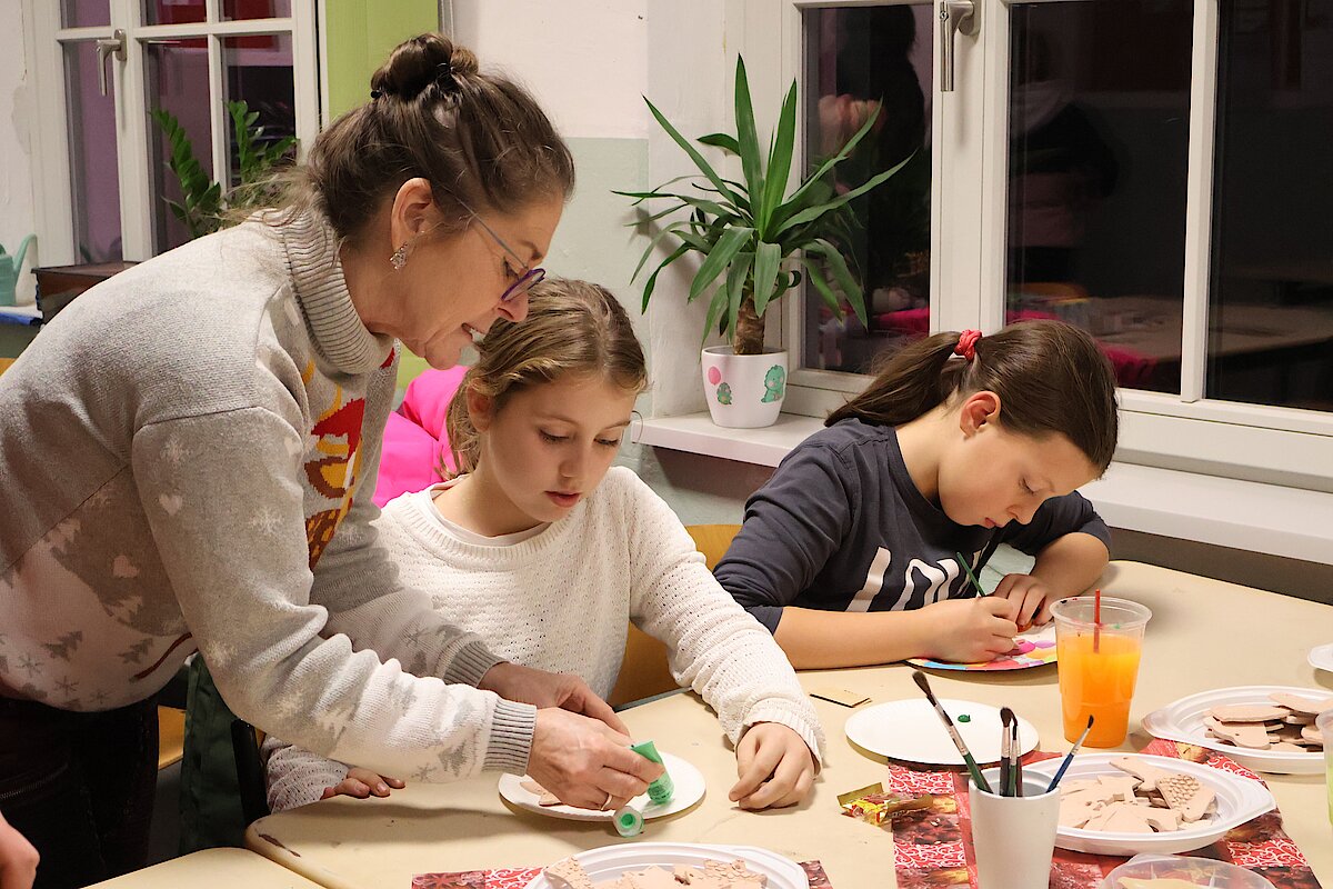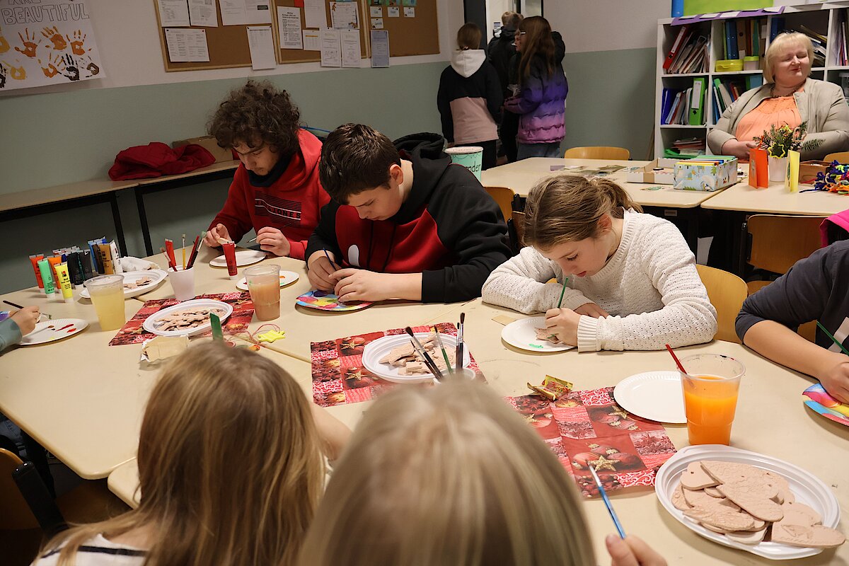 In den Klassenräumen war kreatives Basteln angesagt. Die Eltern der 5. Klasse hatten tolle Bastelideen vorbereitet, bei denen die Kinder mit viel Freude mitmachen konnten. Unsere "Töpferfee" Änne Tanto w war ebenfalls mit von der Partie und bot handgefertigten Weihnachtsbaumschmuck zum Bemalen an. Der süße Duft von frisch gebackenen Waffeln zog durch die Schule, und in der Küche gab es für alle Naschkatzen süße Leckereien.